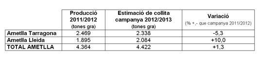 A Lleida, l’increment seria del 10%, passant de les 1.895 tones de l’any passat a les 2.084 d’enguany. A Tarragona, en contrapartida, es preveu una disminució del 5,3% de la collita: es passaria de les 2.469 tones de la passada campanya a les 2.338 tones d’aquesta collita.
