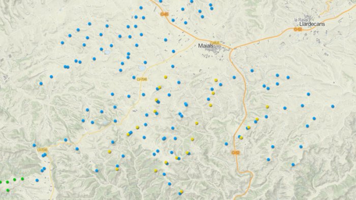 Un dels efectes de la proliferació de projectes eòlics a determinats llocs de la comarca és la coincidència de diferents empreses per situar els seus aerogeneradors als mateixos indrets. De moment, a la zona de Maials i Almatret ja hi ha una quinzena d’emplaçaments on es preveu erigir dues torres de dos projectes empresarials diferents a una distància inferior a la recomanada, que segons l’Institut Català de l’Energia hauria de ser d’un mínim és d’1,5 vegades el diàmetre del rotor de les pales.