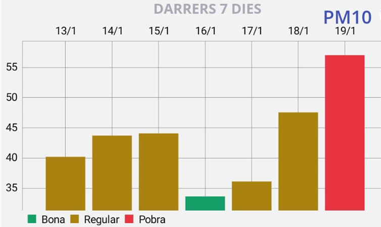 El Centre de Coordinació Operativa de Catalunya (Cecat) ha activat aquest dimecres un avís preventiu per contaminació de micropartícules a les comarques de Ponent, en base a les dades registrades a les estacions de vigilància de la qualitat de l’aire que la Generalitat té a Lleida i a Juneda, les dues úniques a la zona. Segons aquestes, la mitjana diària dels nivells de micropartícules PM10 durant el dia d'ahir van ser superiors al valor de 50 μg/m³ i la previsió era que avui continués igual, ja que l’estabilitat atmosfèrica persisteix i no ajuda a dispersar els contaminants. A més de Ponent, l’altra zona de Catalunya amb una situació semblant és l’anomenada Zona de Protecció Especial, això és, 40 municipis del Barcelonès, el Baix Llobregat, el Vallès Occidental i el Vallès Oriental.