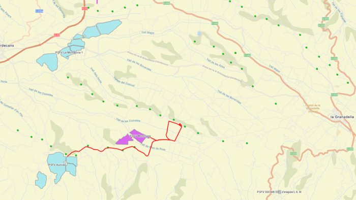 El nou projecte, en color lila. Els punts verds són aerogeneradors en funcionament.