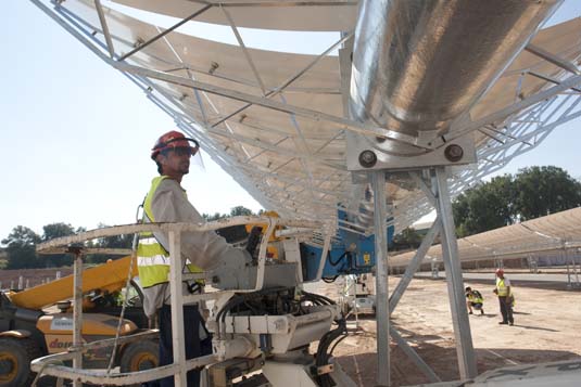 Abantia i Comsa Emte han realitzat aquest dimecres una visita d’obres a la futura termosolar de les Borges Blanques, primera instal•lació mundial en combinar la tecnologia solar termoelèctrica amb una unitat de biomassa. La multinacional alemanya Siemens ha iniciat recentment els treballs de muntatge dels primers plafons solars , dels 2.688 que hi haurà en total -de 5,5 metres de diàmetre cadascun i 12 metres de longitud en les 96 hectàrees de la finca. La seua instal·lació durarà vuit mesos.