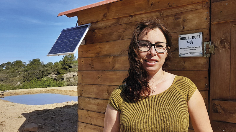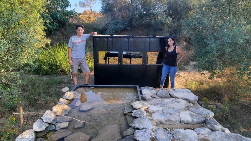 Pau Bonet i Tània Cemeli davant un dels seus observatoris (Foto: Hides del Gregal)