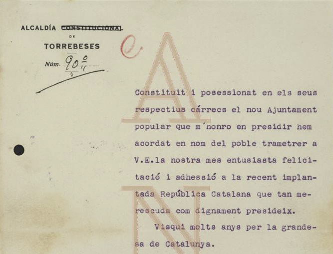 Constituit i posessionat en els seus respectius cárrecs el nou Ajuntament popular que m'honro en presidir hem acordat en nom del poble trametrer a V.E.la nostra mes entusiasta felicitació i adhesió a la recent implantada República Catalana que tan merescuda com dignament presideix.