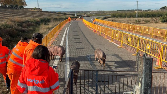 Imatge curiosa avui a Llardecans. El tram de carretera C-12 que passa pel municipi ha estat l’escenari d’una prova amb què la Direcció General d’Infraestructures de Mobilitat de la Generalitat, titular de la via, vol estudiar la presència d’animals com senglars i cabirols a la calçada. En una cinquantena de metres s’ha tancat l’espai al trànsit i, amb la col·laboració d’un granger de la localitat, s’hi ha fet moure quatre porcs de granja, i el mateix s’ha fet amb persones caminant, gossos i ciclistes voluntaris.