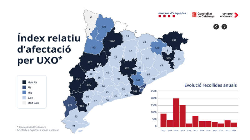 Els Mossos d'Esquadra, a través de l'àrea Tedax-NRBQ encarregada de trobar i desactivar artefactes explosius, ha elaborat un mapa amb totes les intervencions realitzades des de l'1 de gener de 2012 fins a dia d'avui relacionades amb la troballa d'artefactes provinents de conflictes bèl·lics històrics arreu del territori català. En total, el mapa comptabilitza 8.273 artefactes en aquests 12 anys, entre els quals hi ha 2.081 projectils d'artilleria, 100 bombes d'aviació, 2.110 granades de mà, 3.491 granades de morter, 26 granades de fusell, 237 espoletes, 17 bombardes, 189 coets i 6 mines. La majoria d’intervencions estan relacionades amb conflictes bèl·lics del passat com les Guerres de Successió dels segles XVII-XVIII, la invasió napoleònica o Guerra del Francès, les Carlinades i, sobretot, la Guerra del 1936-1939.