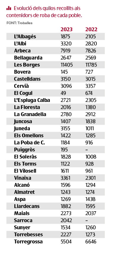 A quasi tots els municipis de l'àmbit informatiu garriguenc hi ha un contenidor de recollida de roba. Els únics que no en tenen són Fulleda, Tarrés i Granyena (a Alfés s'ha posat recentment). Aquests contenidors els instal·len els respectius consells comarcals, amb el suport de l'Agència de Residus de Catalunya, i la roba que s'hi recull la gestiona l'empresa d'inserció Troballes, de Càritas diocesana de Lleida, amb l'objectiu de seleccionar-la i donar-li nous usos.