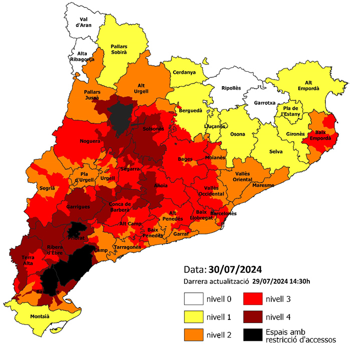 El nivell 4 permet aplicar mesures que ja es preveien amb el nivell 3 abans de la reforma, com el tancament d’accessos a massissos forestals o la restricció o suspensió d'activitats vulnerables en zona forestal. En un context com l’actual de risc extrem d’incendi, també queda prohibida la caça, fer foc en àrees recreatives menys de 500 metres de zona forestal i utilitzar màquines picadores al camp, també a menys de 500 metres de zona forestal. Per tasques de la sega cal trucar als Agents Rurals i donar compte de la ubicació de la màquina recol·lectora.