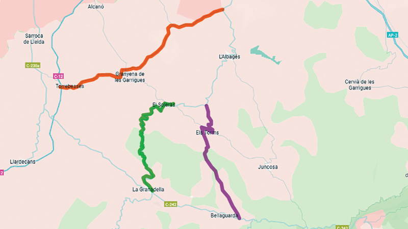 Al mapa, les tres vies que la Generalitat i la Diputació van acordar arranjar. L'eix Torrebesses-Castelldans, batejat com a "Eix Transversal de Ponent" passarà a la Generalitat, i la C-233 entre la Granadella i el Soleràs, a la Diputació. La pista Bellaguarda-els Torms seguiria sent municipal.