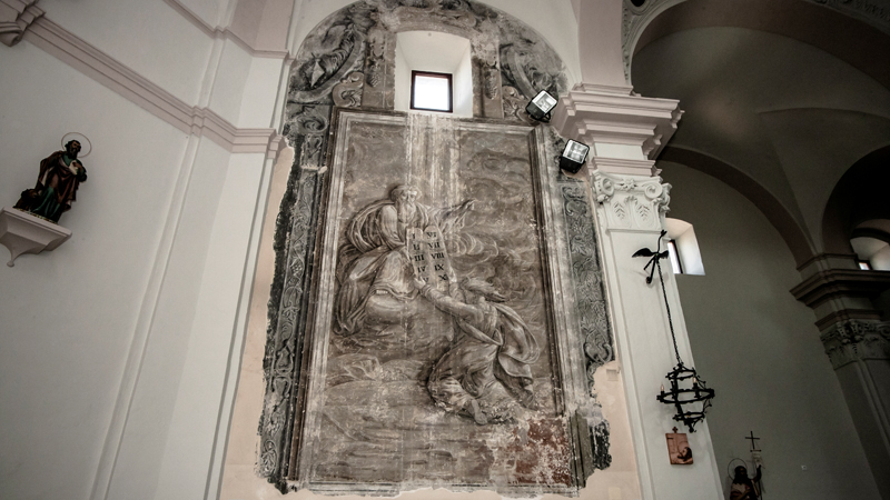 Després d'unes primeres inspeccions, sota la capa de morter existent hi van aparèixer dues representacions pictòriques fetes amb la tècnica de la grisalla que remetien a escenes del personatge bíblic Moisès. A la part dreta del presbiteri s'hi troba l'escena del pas del mar Roig per part del poble jueu: l'escena se situa just en el moment en què les aigües ja han tornat al seu lloc, ofegant l'exèrcit del faraó. L'escena és presidida per Moisès, al centre, que manté els braços aixecats i mira cap al cel. Al mur esquerre, s'hi observa l'escena a la muntanya del Sinaí, quan Moisès hi puja a recollir els deu manaments. L'escena mostra Déu mig assegut sobre un núvol sostingut per àngels que toquen les trompetes. El creador sosté amb la mà dreta les taules i amb l'esquerra assenyala amb el dit indicant a Moisès que les porti al poble, el profeta es manté agenollat sobre la roca.