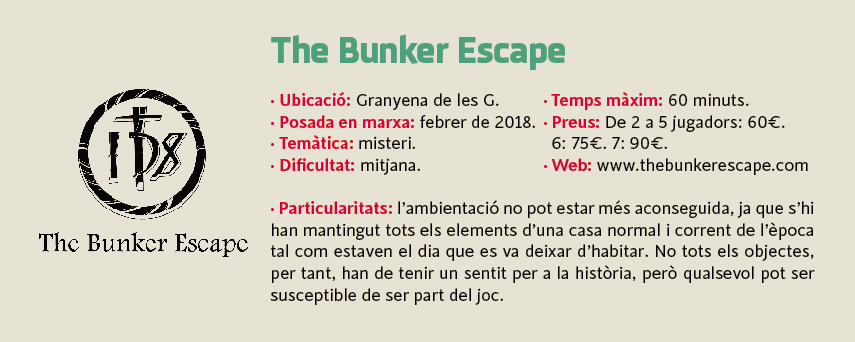 Més recent, tot just del febrer d'enguany, ha obert a Granyena la segona experiència d'aquest tipus a la comarca, The Bunker Escape. És també una escape house, és a dir, s'utilitza tota una casa, també de quatre plantes. La gestionen Marc Estopà i Jordi Guiu, dos pagesos de 27 anys que ja tenien afició per jugar a escapes. En aquest cas, no hi ha l'element del terror, on veien un possible factor limitant, però sí una història fosca, ambientada a la Granyena dels anys 60 en el si d'una família molt religiosa. Una de les gràcies de l'espai és que pràcticament tot el que hi ha a la casa ja hi era. Es pot dir que el Marc i el Jordi quasi que no han alterat l'escenari i un entra, realment, en una casa d'uns padrins de poble i en remena armaris, calaixos i el que faci falta. En lloc de pensar quins objectes podien servir per a la trama i buscar-los, ha estat a la inversa: "et plantes davant l'objecte que ja hi ha i li busques un sentit que s'adapti a la història", expliquen els impulsors.