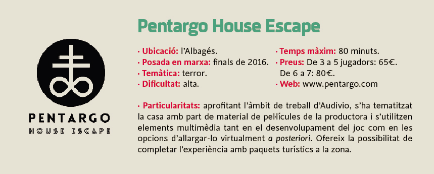 Entrar en una casa, robar una documentació i sortir-ne abans de ser descobert. Aquest és l'objectiu que tenen els grups que participen a Pentargo, l'escape room que hi ha a l'Albagés. Impulsada el 2016 per l'empresa Audivio, del mateix poble, va ser la primera d'aquest tipus a la comarca [v. SomGarrigues, 428]. Des del febrer d'aquest any n'hi ha un altra a Granyena, The Bunker Escape, i d'aquí cinc o sis setmanes està previst que se n'obri una altra a Alcanó, Manoir. Tres experiències que fan de les Garrigues la zona de Ponent amb més concentració d'escape rooms després de Lleida ciutat. Només una a Artesa de Segre i una a Sant Guim de Freixenet completen el mapa. Ni a Mollerussa, ni a Tàrrega, ni a Balaguer, ni a les Borges, per exemple, n'hi ha cap altra, de moment.
