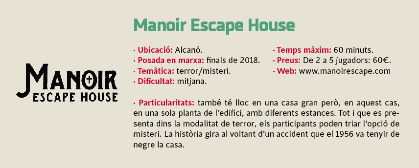 On també veuran aviat petits grups passejant pel poble buscant una casa on jugar és a Alcanó, on l'Eduard Marsellés i l'Enric Albareda, també aficionats a aquest món, estan a punt d'obrir l'escape Manoir. Com Pentargo i The Bunker Escape, s'ha fet en una casa de poble, ambientada als anys 40-50 i al voltant d'una història de terror. Preveuen que serà de dificultat mitjana, ja que "la por no et permet rendir al 100%", diuen. "No és el mateix resoldre un puzle tranquil·lament que fer-ho pendent de si t'entra algú per la porta". I no diem res més.