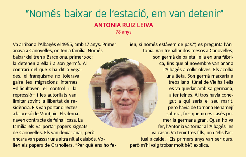 L'Albagés no entrava específicament al full de ruta migratori d'aquells andalusos, el full de ruta no era altre que anar allà on hi hagués feina, i ja se sap que els camins vitals són atzarosos. Algú es va assabentar que aquí es collien olives, com allà, i que es feia entre Tots Sants i Nadal, és a dir, abans que allà. Per tant, es podien enllaçar les dues campanyes. I el boca-orella va fer la resta. Cada any venia gent a collir olives i, per Nadal, marxava; però cada any, també, alguns s'hi quedaven, dues o tres famílies. A vegades treballaven als pobles del voltant, com Castelldans, però va ser a l'Albagés on es va concentrar el gruix d'aquella immigració benamejicense. Al cap de poc, qui no hi tenia un cosí, hi tenia un germà. Com l'Antonia Ruiz, que va arribar el 1955, amb 17 anys, i hi tenia sa germana Teresa, que havia arribat l'any anterior. O l'Aurora García, que va venir el 1956, també amb 17 anys; ella i els seus pares van seguir els passos de son germà Francisco, que havia arribat amb 22. El mateix any arribava la Dolores Gómez, amb 23 anys d'edat, per ajuntar-se amb els pares i un germà que ja eren aquí. I així, cosint i recosint fils familiars, la comunitat es va fer gran.