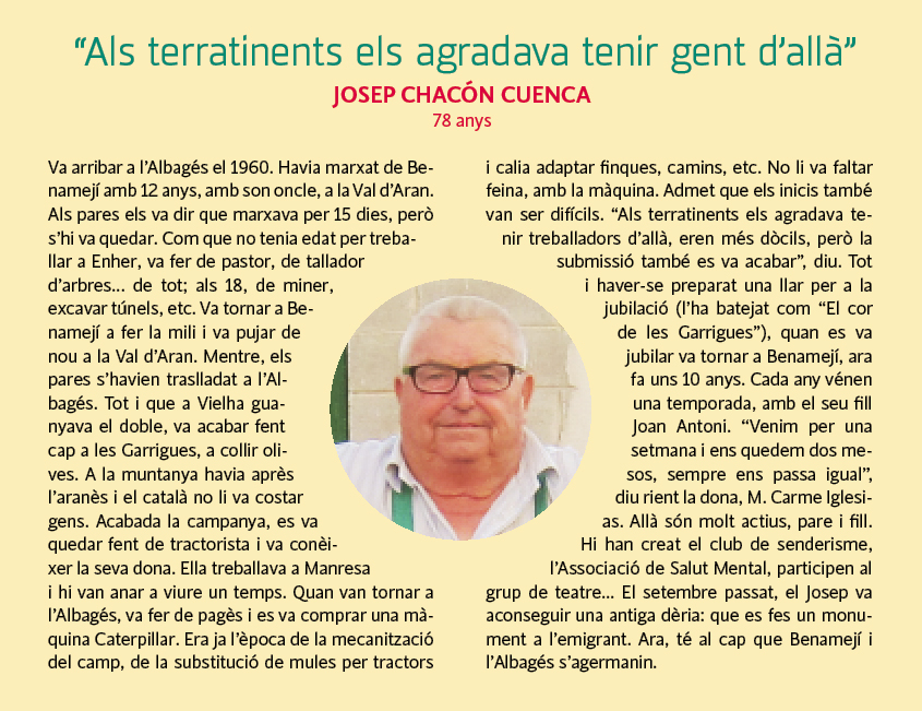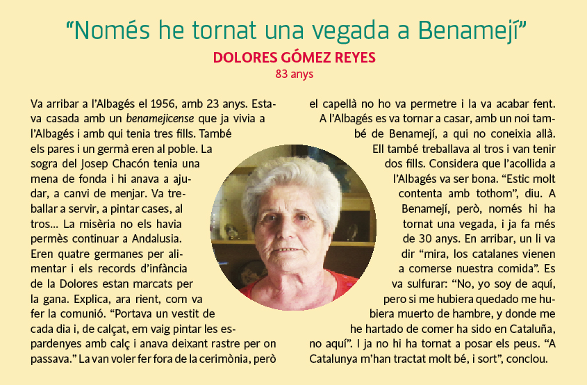 Poc s'ha parlat, però, de les ramificacions d'aquest moviment migratori en el món rural, que també van existir; en menor mesura, òbviament, però hi eren. I un dels casos més curiosos és el de l'Albagés, on el fenomen va tenir una intensitat especial. Entre 1954 i 1960, aproximadament, van arribar desenes de persones provinents d'Andalusia, una dotzena de famílies més o menys; amb una particularitat: gairebé totes eren del mateix poble, Benamejí.