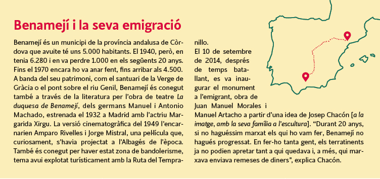 Quasi tota migració és conseqüència de l'afany d'una vida millor. Es fuig de la guerra i es fuig de la falta d'oportunitats. A les Garrigues, la guerra es va acabar el 1939. La gent no es moria de gana (l'accés als aliments, almenys, no era impossible), però els anys de postguerra van ser, probablement, els més difícils de tot el segle XX per a la subsistència. I la combinació de postguerra i món rural, normalment, acaba en èxode. Es fa difícil concebre aquesta comarca, aleshores, com a terra d'arribada i no de sortida, però sí, sempre hi ha qui ho passa pitjor. Com a Benamejí. Aquell poble andalús, que llavors tenia uns 6.000 habitants, era en terra de latifundis. Señoritos i jornalers. Uns adjudicaven la feina a dit i els altres esperaven que aquell dia hi hagués sort. Però quan passen els anys i hi ha fills per alimentar, no es pot comptar només amb la sort.